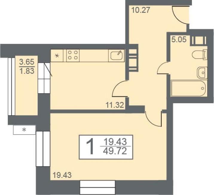 Общая площадь 49,72 м2 . Жилая площадь 19,43 м2 . Кухня 11,32 м2 .
