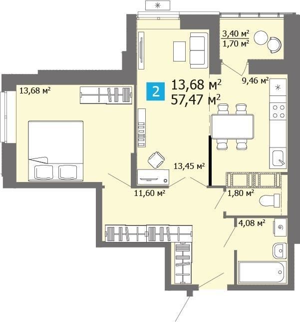 Общая площадь 57,47 м2 . Жилая площадь 27,13 м2 . Кухня 9,46 м2 .