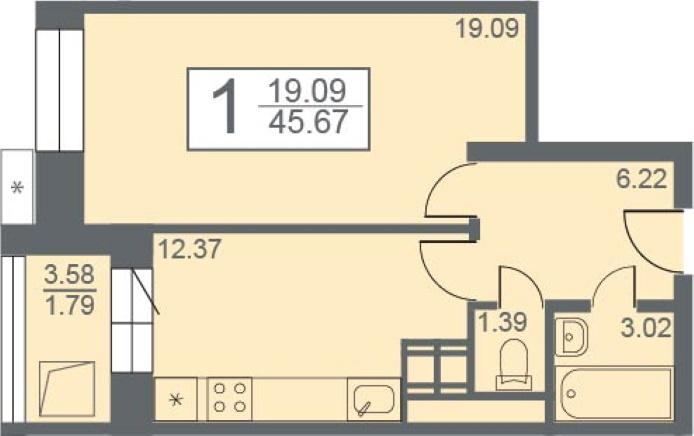 Общая площадь 45,67 м2 . Жилая площадь 19,09 м2 . Кухня 12,37 м2 .