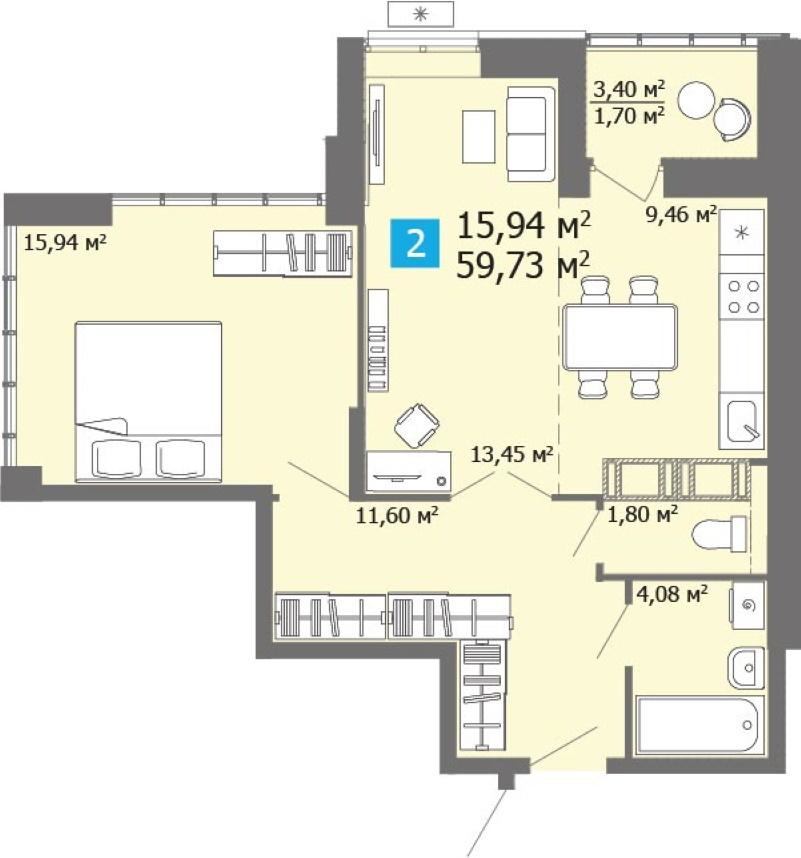 Общая площадь 59,73 м2 . Жилая площадь 29,39 м2 . Кухня 9,46 м2