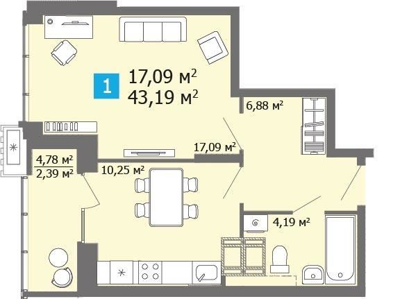 Общая площадь 43,19 м2 . Жилая площадь 17,09 м2 . Кухня 10,25 м2 .