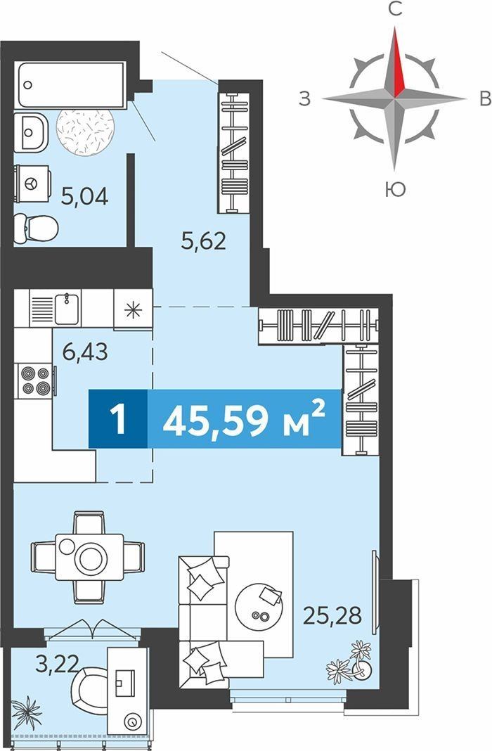 Общая площадь 45,59 кв.м. , жилая площадь 25,28кв.м., кухня 6,43 кв.м. , с/у совмещен , лоджия 3,22кв.м.. Имеется выбор этажей и планировок .