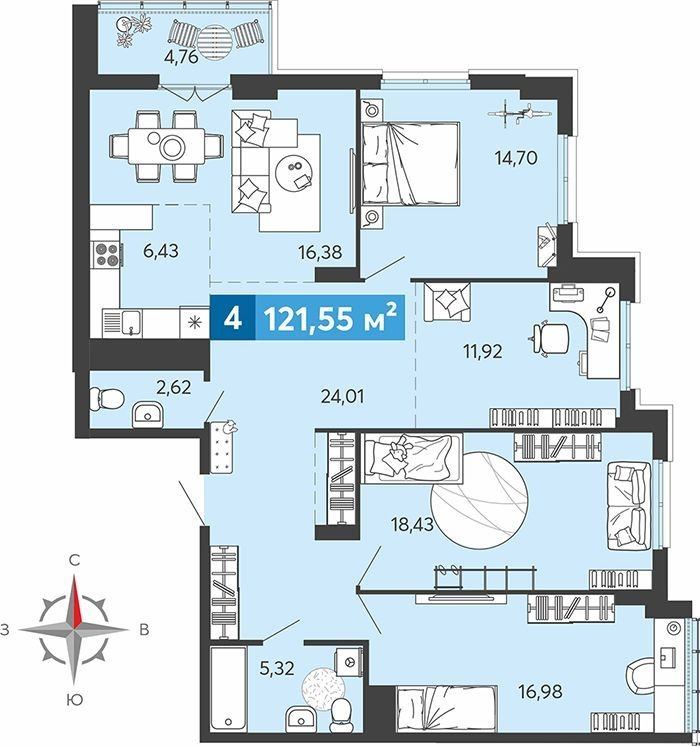 Общая площадь 121,55кв.м. , жилая площадь 78,41кв.м., кухня 6,43кв. м. , 2 сан узла , лоджия 4,76кв.м. . Имеется выбор этажей и планировок .