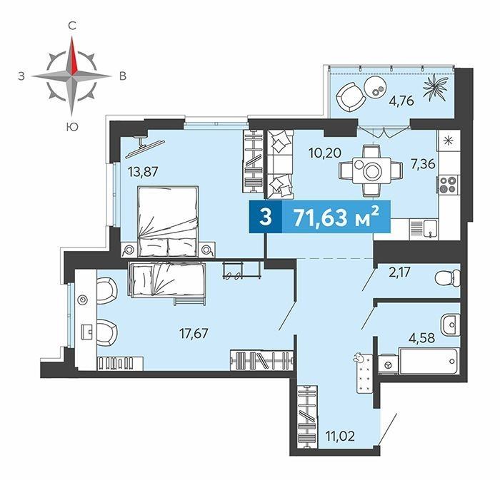 Общая площадь 71,63кв.м. , жилая площадь 41,34кв.м., кухня 7,36кв. м. , с/у раздельный , лоджия 4,76кв.м.