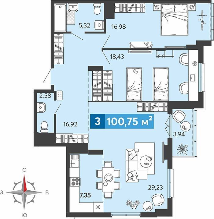 Общая площадь 100,75кв.м. , жилая площадь 64,64кв.м., кухня 7,35кв. м. , 2 сан узла , лоджия 3,94кв.м.