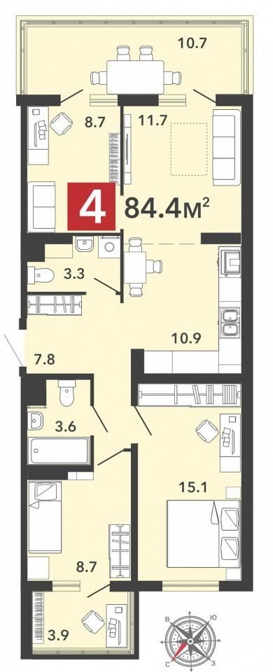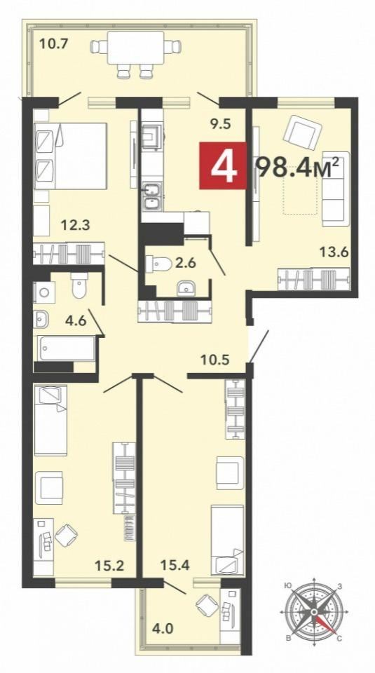 4 комнатные по ул. Фонтанная, 70 стр. , «Радужные дворы» , Спутник (84,5м2)
