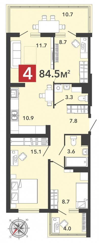 Общая площадь 84.5м2 , жилая площадь 44,2м2 , кухня 10,9м2, 2 сан узла, 2 лоджии 3,9. и 10,7м2 Этаж с 1 по 12. Имеется выбор планировок и этажей .