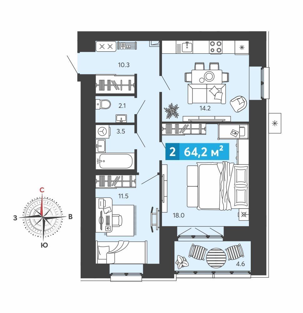 Общая площадь 64,2 кв.м. Жилая 29,5 кв.м. Кухня 14,2 кв.м. С/у раздельный .Лоджия 4,6 кв.м..