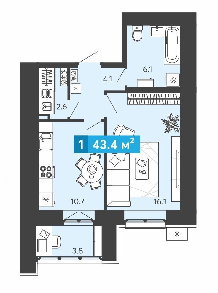 Общая площадь 43,4 м2 . Жилая площадь 16,1 м2 . Кухня 10,7 м2 .Лоджия 3,8 м2 ..