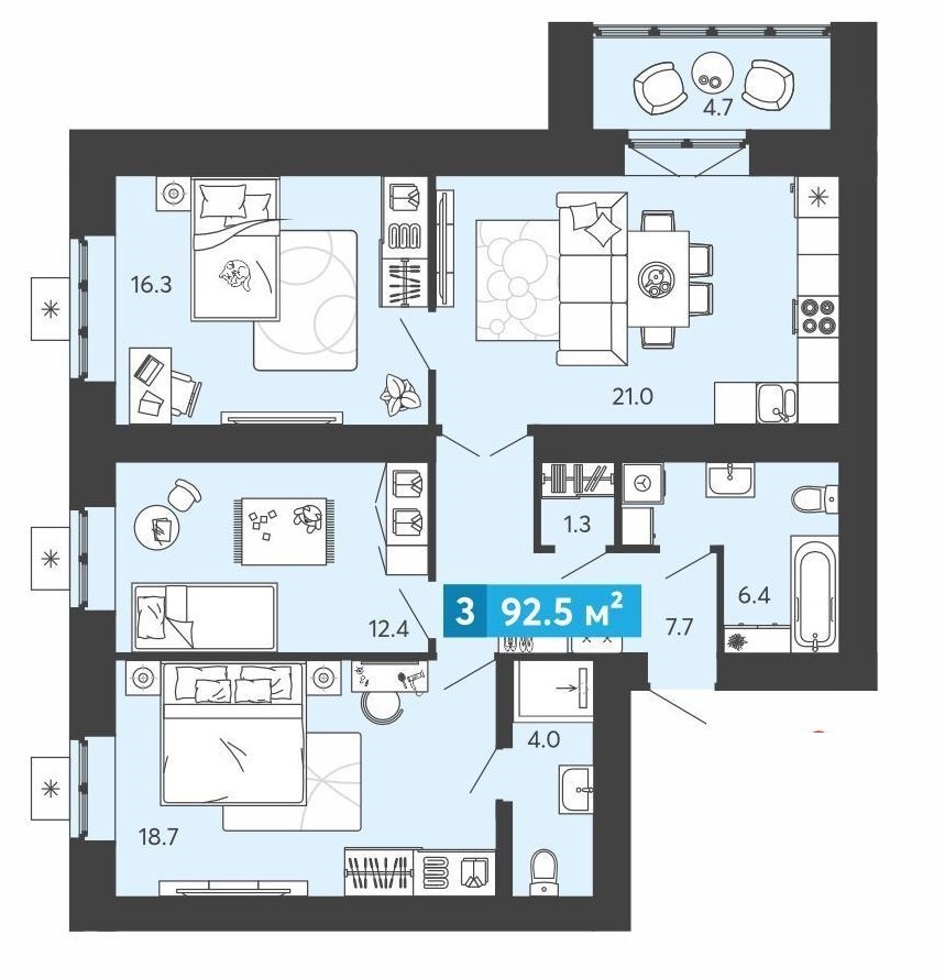 Общая площадь 92,5 м2 . Жилая площадь 47,4 м2 . Кухня-гостиная 21 м2 .Лоджия 4,7 м2 ..