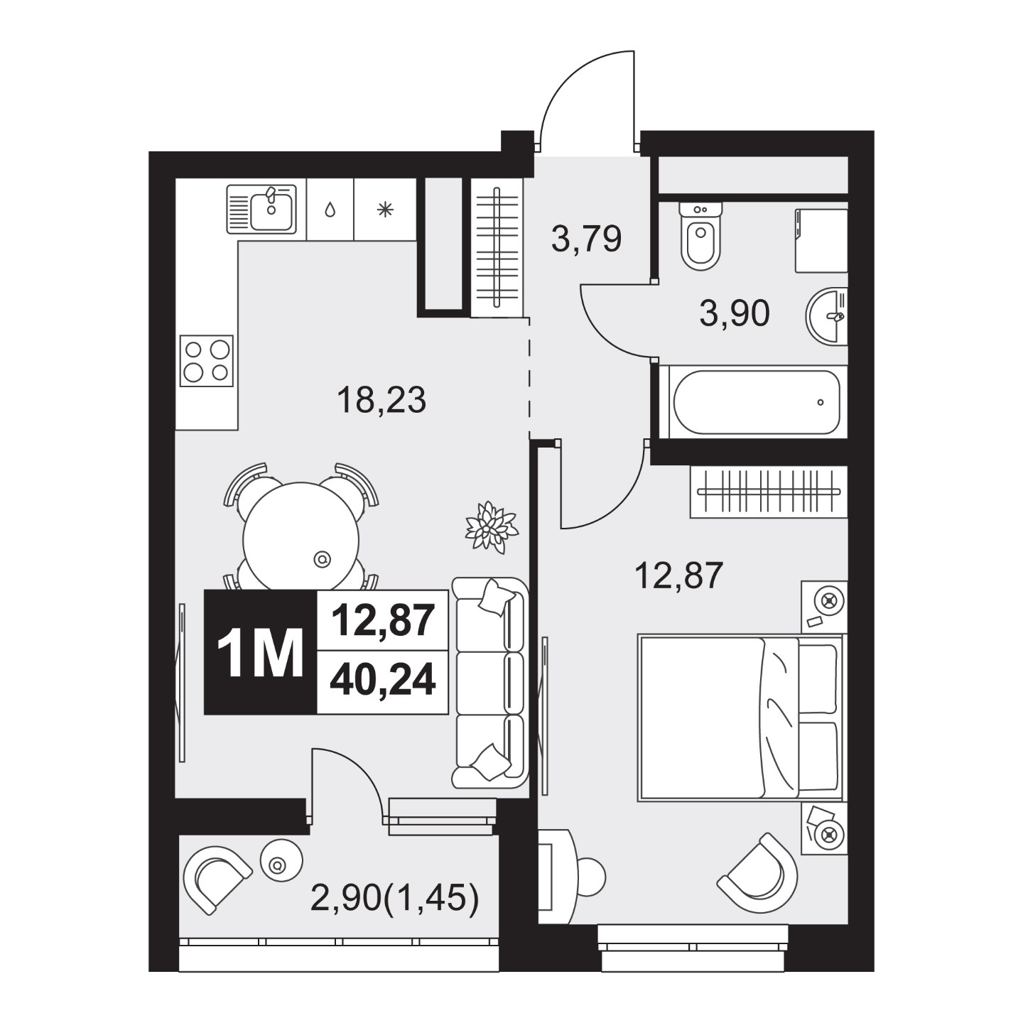 Общая площадь 40,24 кв.м. Комната 12,87 кв.м. Кухня-гостиная 18,23 кв.м. Лоджия 2,9 кв.м.