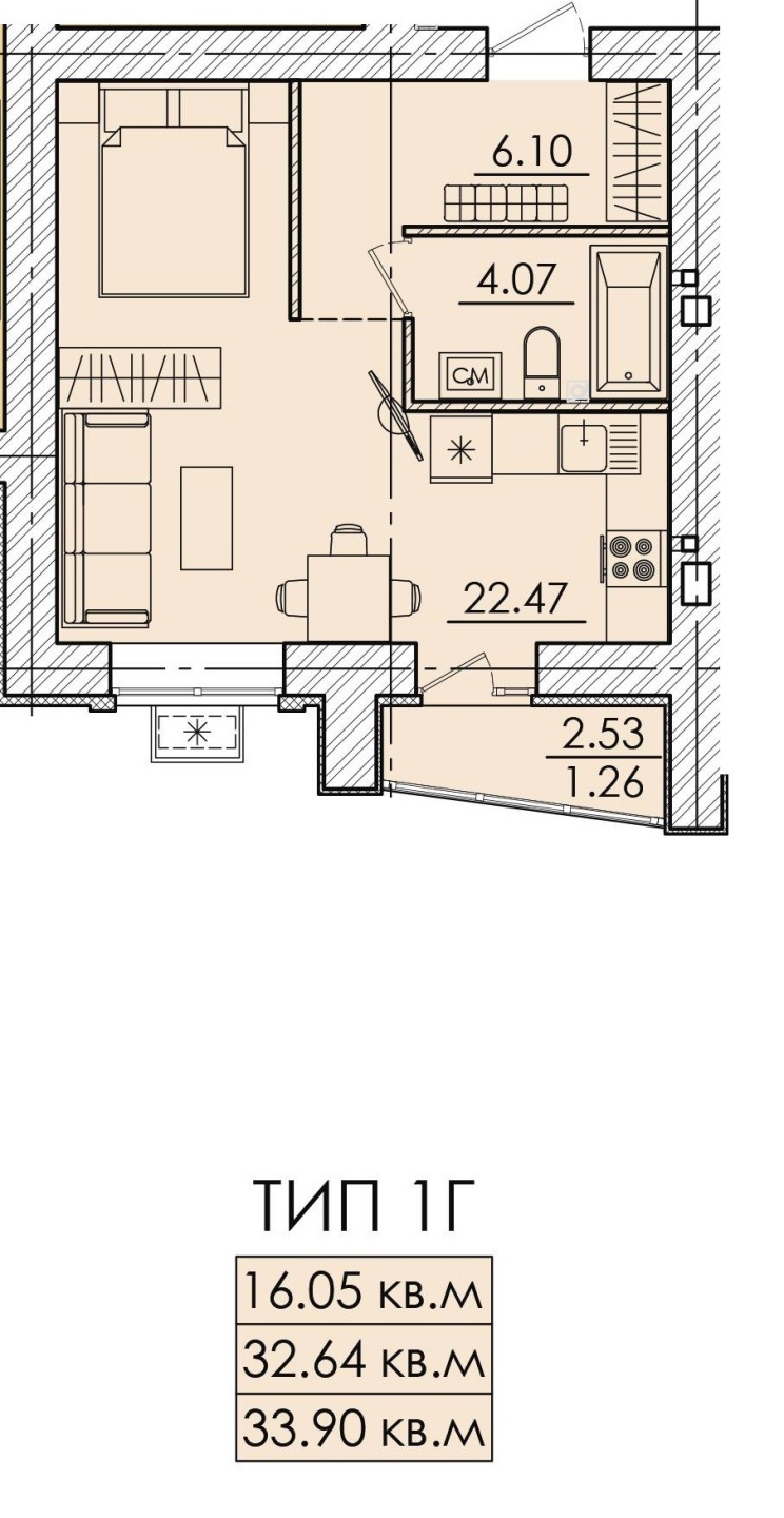 Общая площадь 33,9 м2 . Жилая площадь 16,05 м2 . Кухня 6,42 м2 . Лоджия 2,53 м2 .