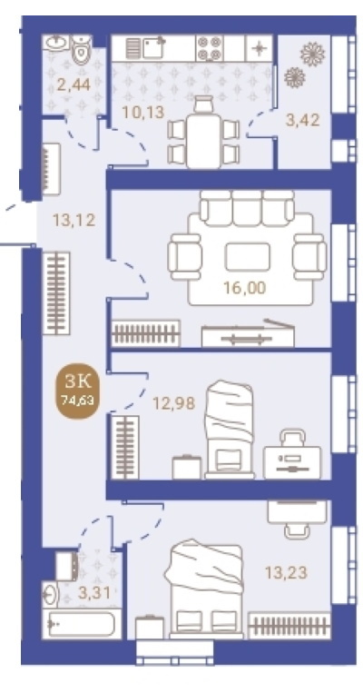 Общая площадь 74,63 кв.м. , жилая площадь 42,21 кв.м., кухня 10,13 кв.м. ,с/у совмещеный - 2 шт., лоджия 3,42 кв.м. .