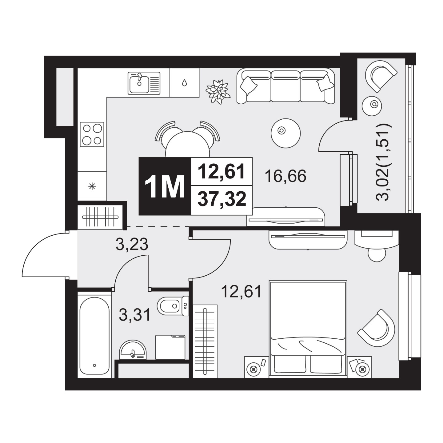 Общая площадь 37,32 кв.м. Комната 12,61 кв.м. Кухня-гостиная 16,66 кв.м. Лоджия 3,02 кв.м.