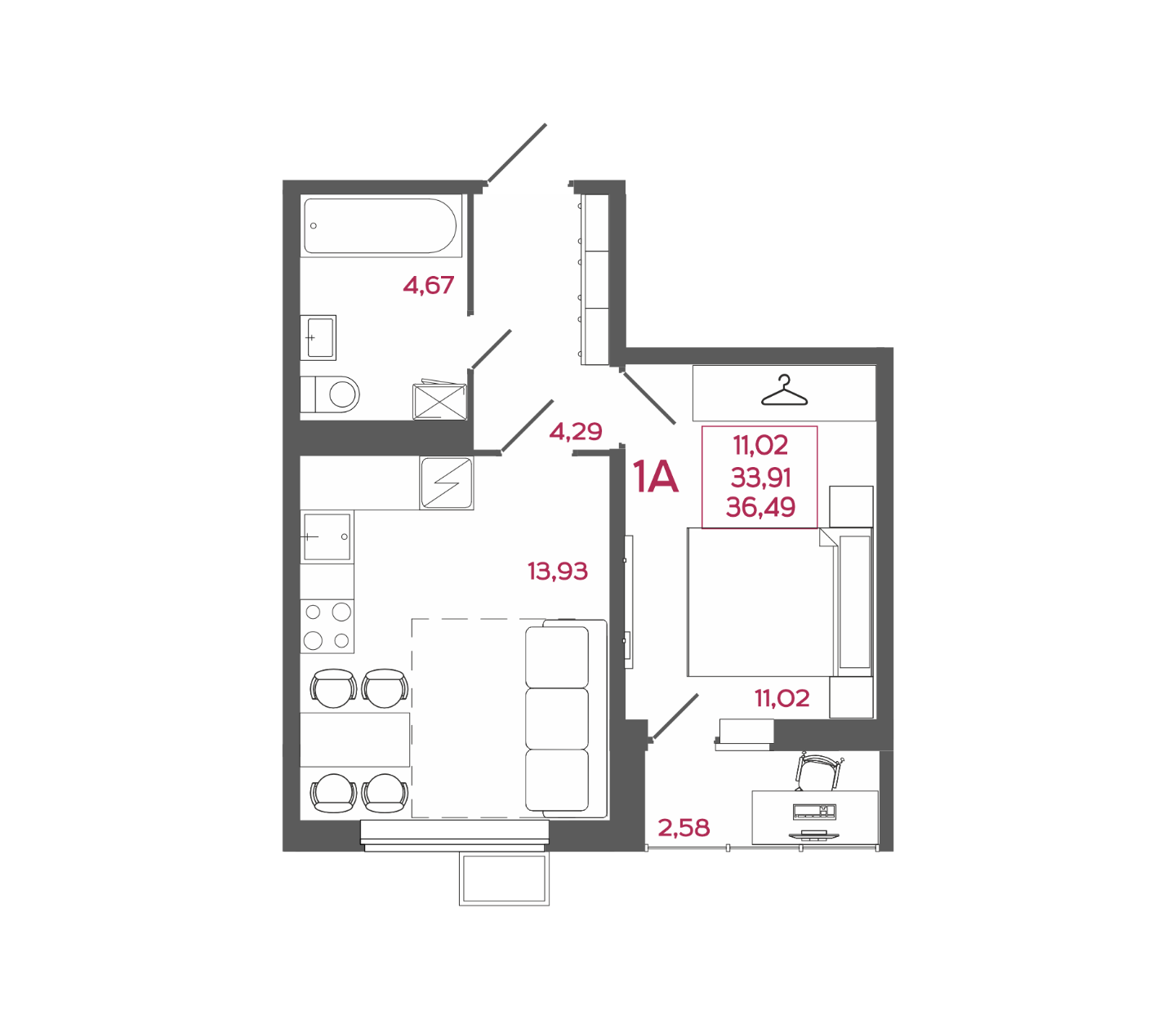 Общая площадь 36,49 кв.м. Комната 13,93 кв.м. Кухня 11,02 кв.м. Лоджия 2,58 кв.м.
