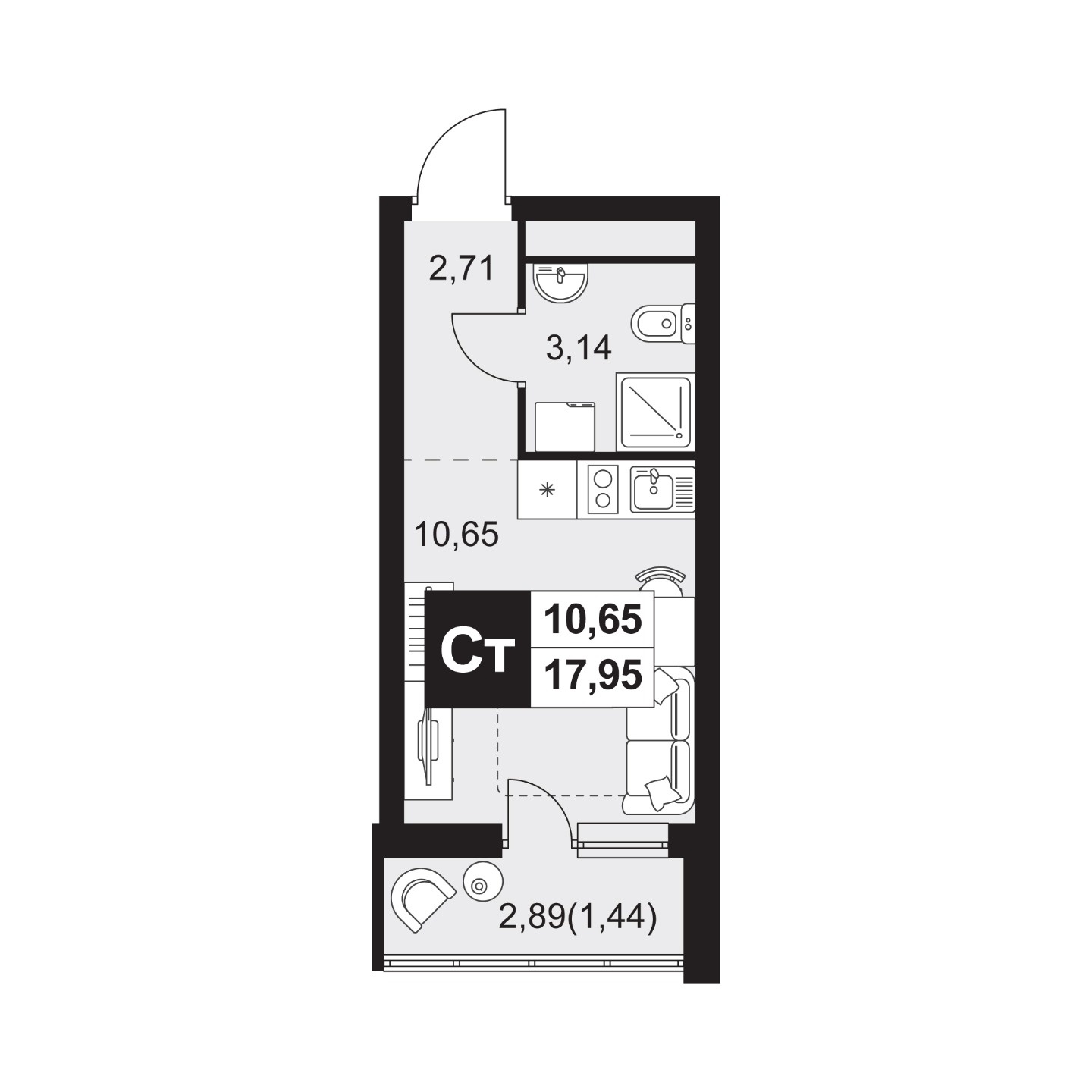 Общая площадь 17,95 кв.м. Комната 10,65 кв.м. Кухня 3 кв.м. Лоджия 2,89 кв.м.
