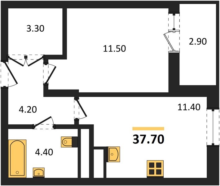 Общая площадь 37,7 кв.м. Жилая площадь 11,5 кв.м. Кухня 14,4 кв.м. .Лоджия 2,9 кв.м.
