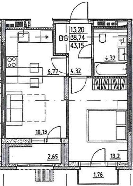 Общая площадь 43,15 кв.м. Жилая площадь 23,33 кв.м. Кухня 6,77 кв.м. Лоджия 2,65 кв.м.