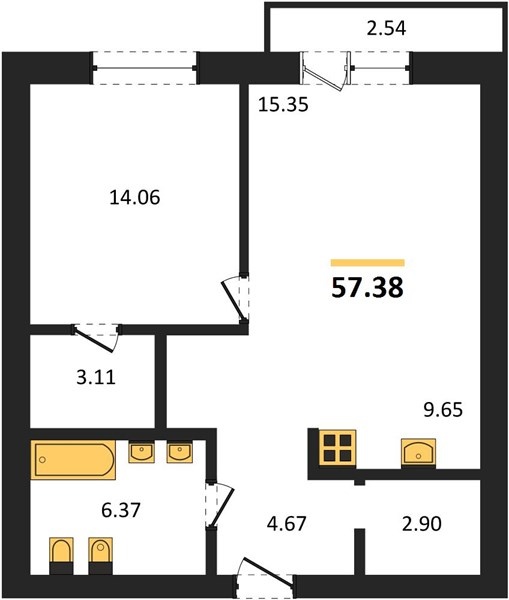 Общая площадь 57,38 кв.м. Жилая площадь 29,41 кв.м. Кухня 9,65 кв.м. Лоджия 2,54 кв.м..Гардеробная 3,11кв.м. и 2,9кв.м.