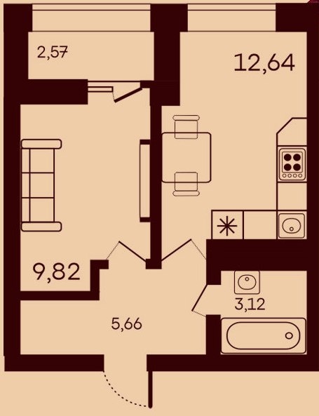 Общая площадь 33.8 кв.м. , жилая площадь 9,82 кв.м., кухня 12,64 кв. м. , лоджия 2.57 кв.м.