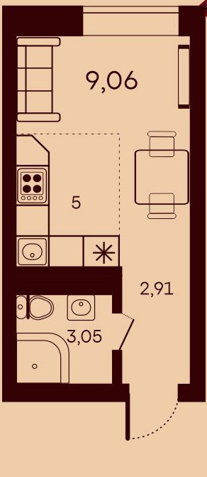 Общая площадь 19,79 кв.м. , жилая площадь 9,06 кв.м., кухня 5 кв. м. ,Имеется выбор этажей и планировок.