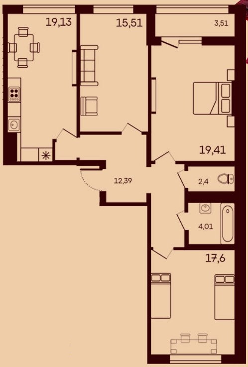 Общая площадь 93,96 кв.м. , жилая площадь 52,52 кв.м., кухня-гостиная 19,13 кв. м. , лоджия 3,51 кв.м..Имеется выбор этажей и планировок.
