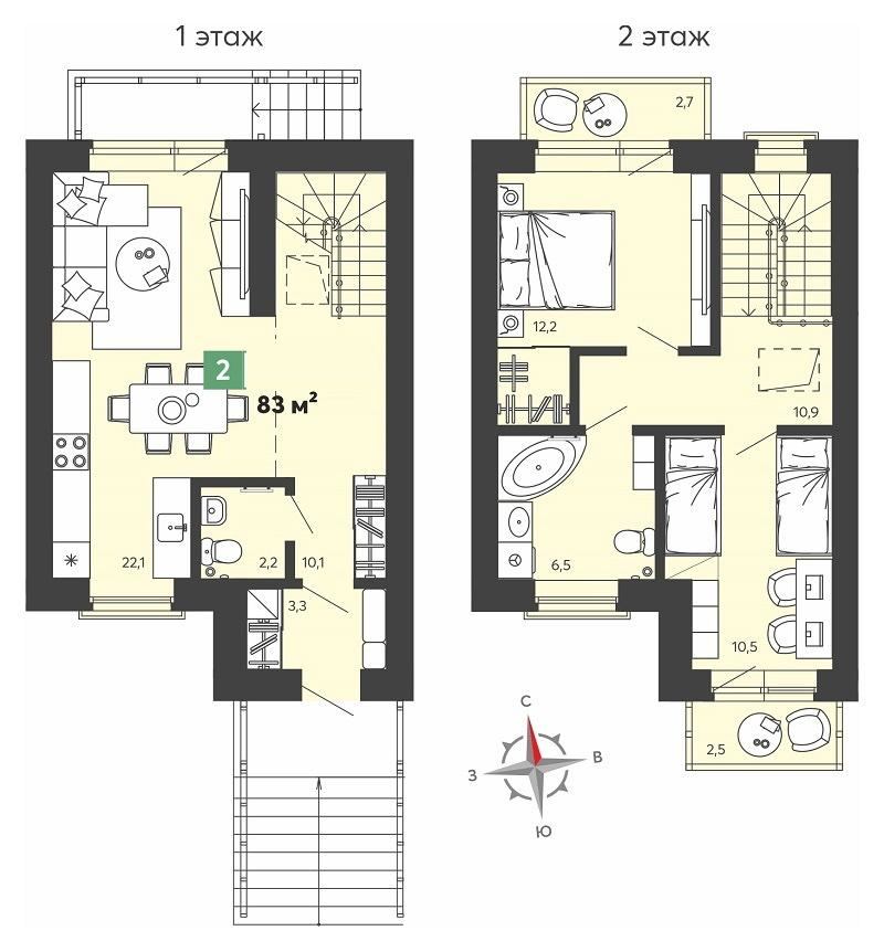 2 этаж : Две Спальни 12,2 кв.и 10,5 кв.м с балконами , сан/узел 6,5 кв.м.