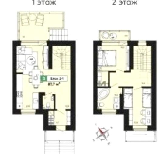 2 этаж : Две Спальни 11,1 кв.и 10 кв.м с балконами , сан/узел