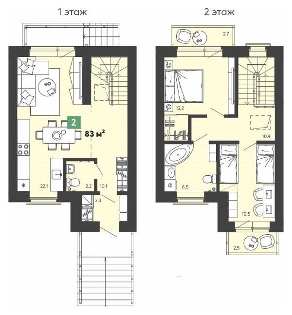 2 этаж : Две Спальни 12,2 кв.и 10,5 кв.м с балконами , сан/узел