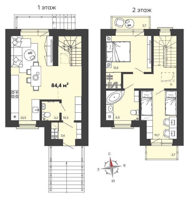 2 этаж : Две Спальни 12,4 кв.и 10,7 кв.м с балконами , сан/узел 6,5 кв.м.