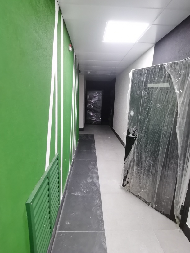 Пластиковое остекление окон и лоджий , штукатурка и шпаклевка стен , стяжка пола , электроразводка заведена в квартиру, металлическая входная дверь .