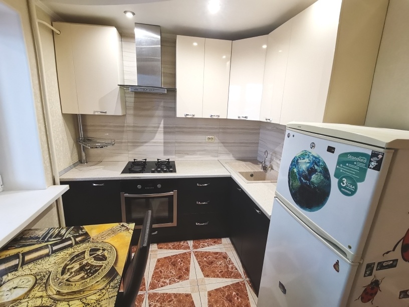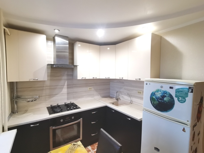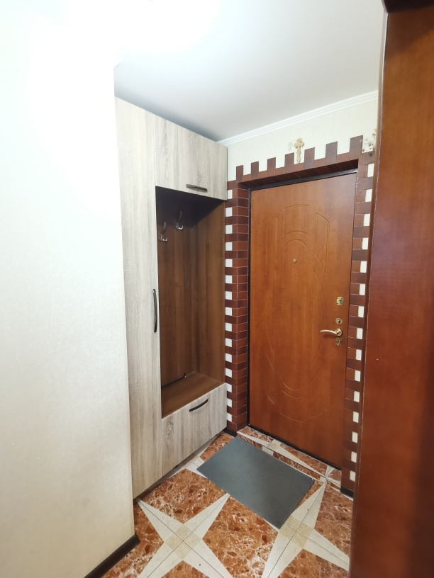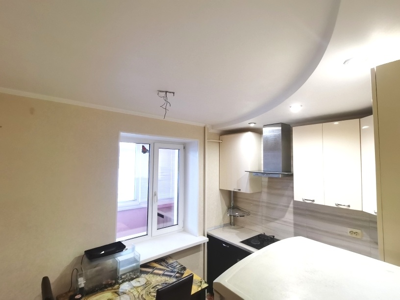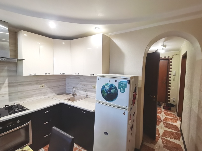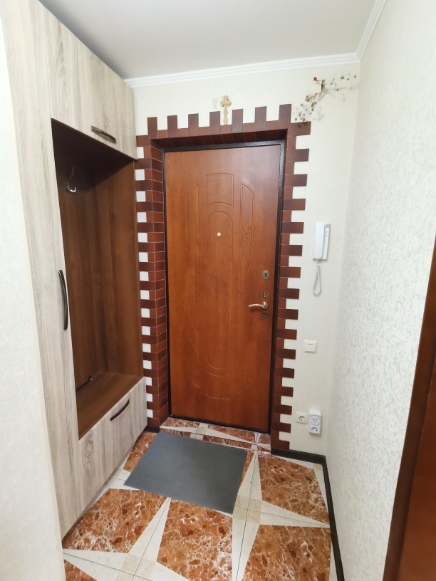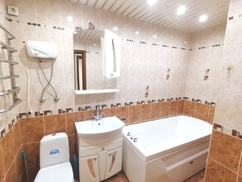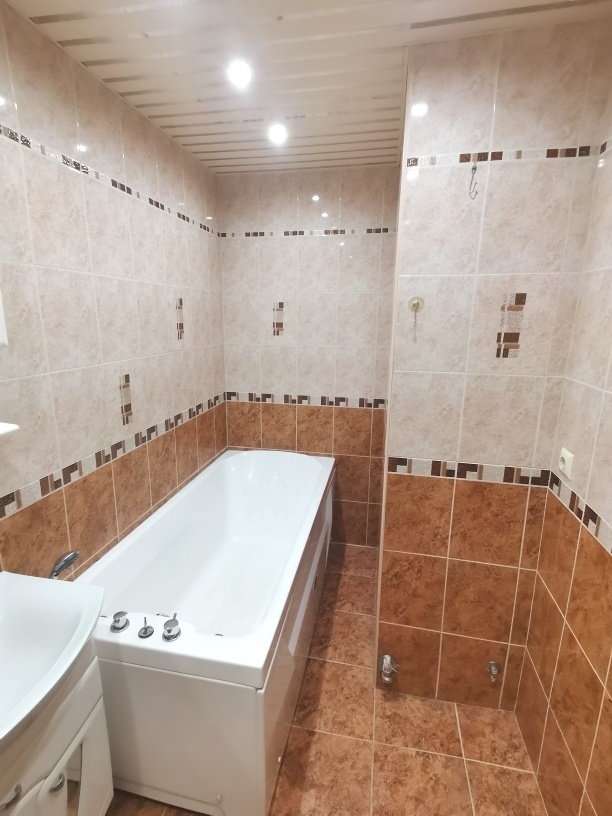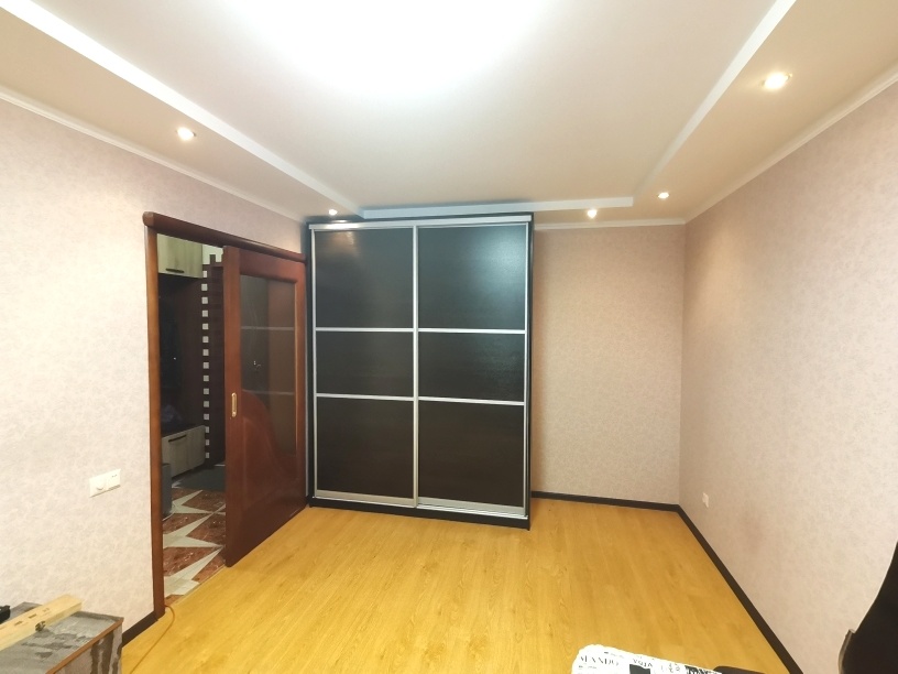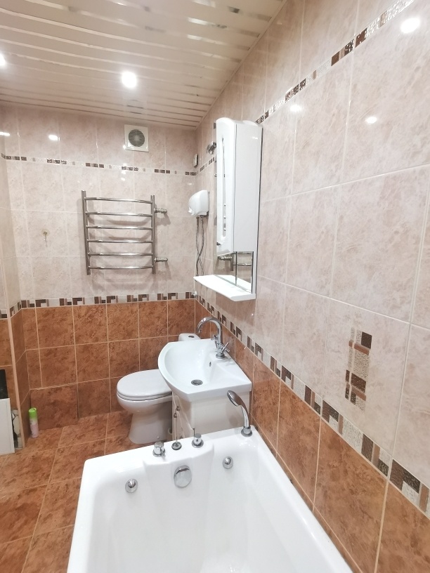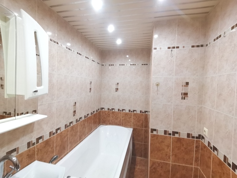 Сделан ремонт из качественных материалов : стены и полы выровнены по маякам , натяжные потолки с точечным освещением стены оклеены итальянскими обоями , установлены межкомнатные двери высокого качества , на полу керамогранит и ламинат высокого класса , с/у совмещен – все отделано кафелем , установлена немецкая сантехника , металлическая входная дверь .