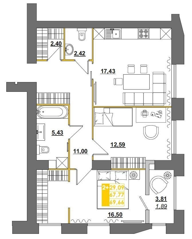 Общая площадь – 73,52кв. м., жилая площадь - 29,09 кв. м., кухня-гостинная – 16,50 кв. м. , 2 сан/узла., лоджия -3,81кв.м.