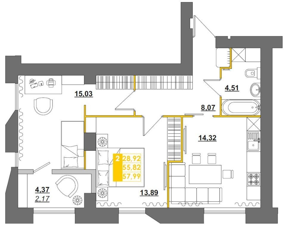 Общая площадь 62,92 кв. м., жилая площадь 28,92 кв. м., кухня 14,32 кв. м. совмещенный санузел, лоджия 4,37 кв.м