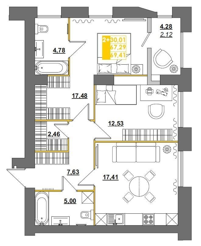 Общая площадь – 73,47кв. м., жилая площадь - 30,01 кв. м., кухня-гостинная – 16,50 кв. м. , 2 сан/узла., лоджия -4,28кв.м.. Имеется выбор этажей и планировок .