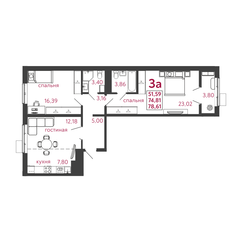 Общая площадь 78,61 кв.м.. Жилая площадь 51,59 кв.м. .Кухня 7,8 кв.м..Лоджия 3,8 кв.м.