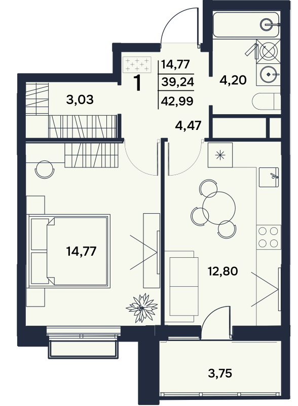 Общая площадь: 42,99 кв.м. Жилая площадь: 14,77кв.м. Площадь кухни: 12,8 кв.м. Гардеробная 4,2 кв.м. С/у: совмещен . Лоджия: 3,75 кв.м. Высота потолка 2,7 м .