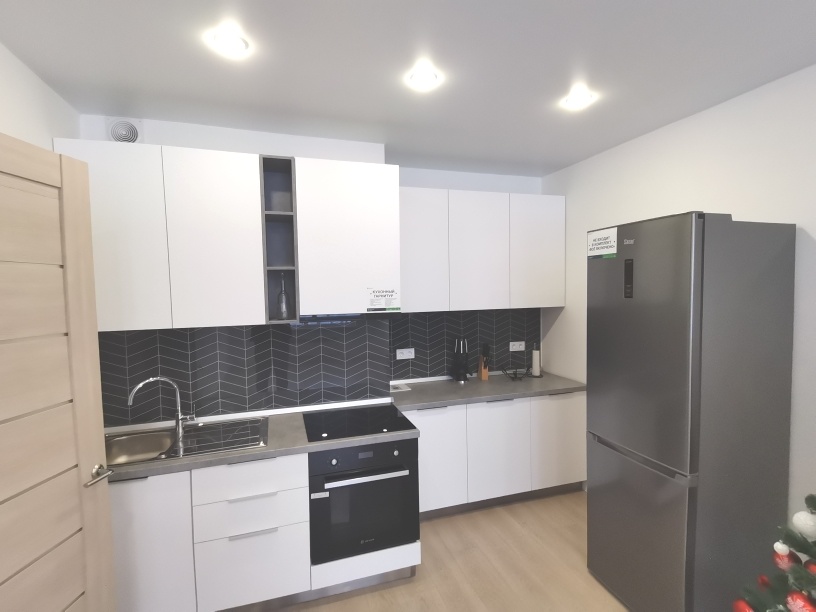 Квартира с готовым ремонтом: обои под покраску, ламинат 33 класса, натяжные потолки с точичными светильниками, керамическая плитка в санузле Kerama Marazzi, установлена вся сантехника, межкомнатные качественные двери, кухонный гарнитур с посудомоечной машиной, современный ремонт, светлый или серый оттенок пластика для фасада кухни великолепно сочетается с деревом, фурнитура для кухни элитного класса BLUM, встраиваемая техника, встроенная вытяжка, варочная панель.