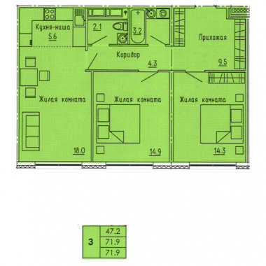Общая площадь 71,9 кв.м., Жилая 47,2кв.м.. Кухня 5,6кв.м. Сан. узел раздельный.