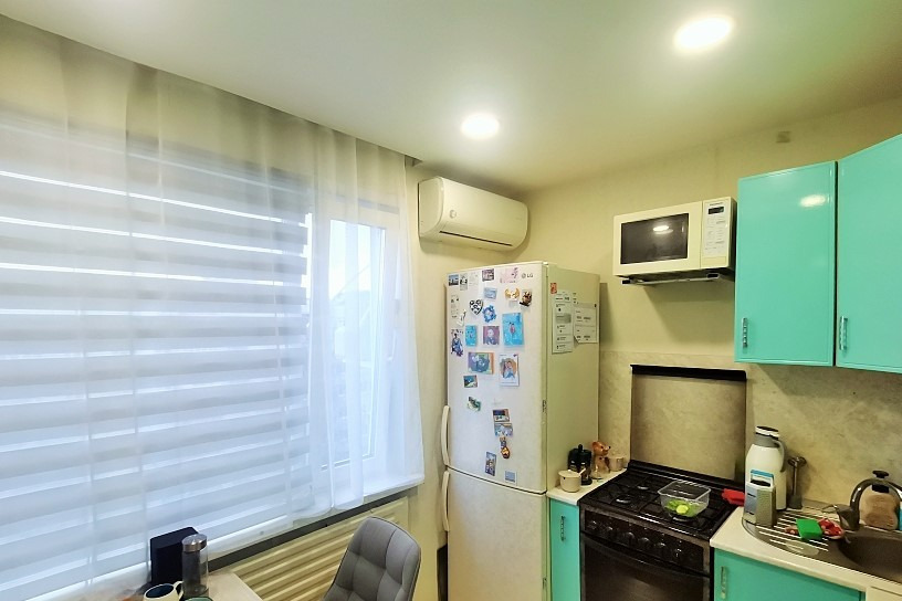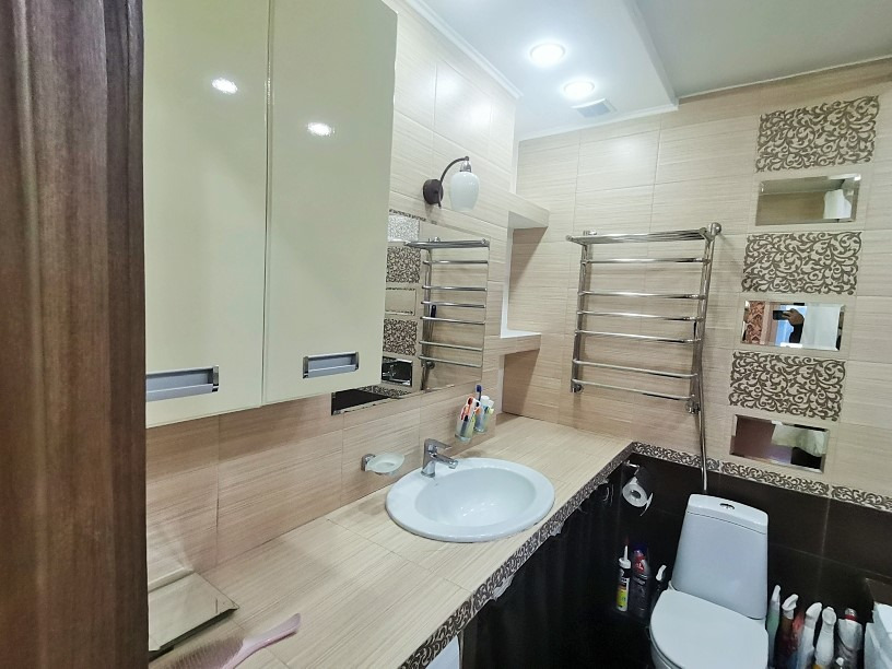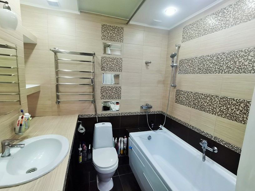 В квартире сделан ремонт из качественных материалов : В прихожей на полу кафель ; Сан/узел совмещенный - испанский кафель , полы с подогревом , все трубы заменены , акриловая ванная ; Потолки натяжные ; Полы в комнате - ламинат ; Двухуровневое освещение . Два кондиционера ; Пластиковые окна ; Балкон застеклен пласт . Все в хорошем состоянии .