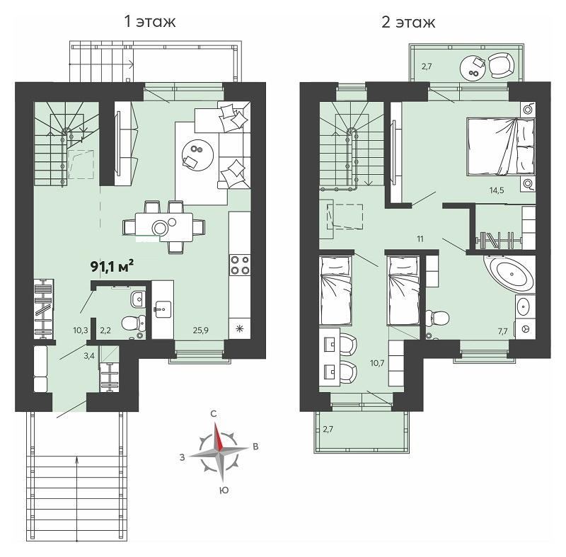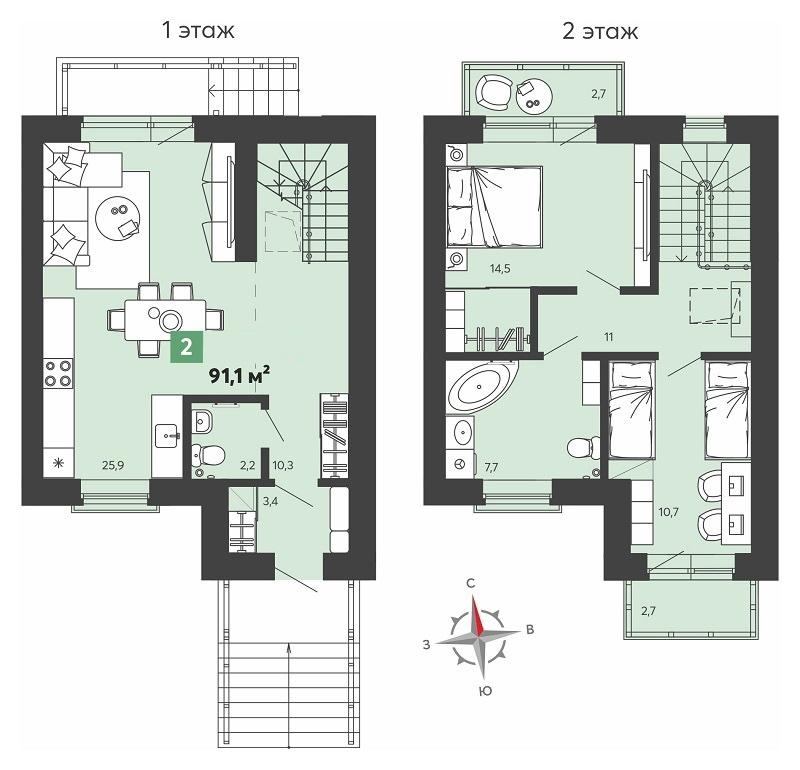 2 этаж : Две Спальни 14,5 кв.и 10,7 кв.м с балконами , сан/узел 7,7 кв.м.
