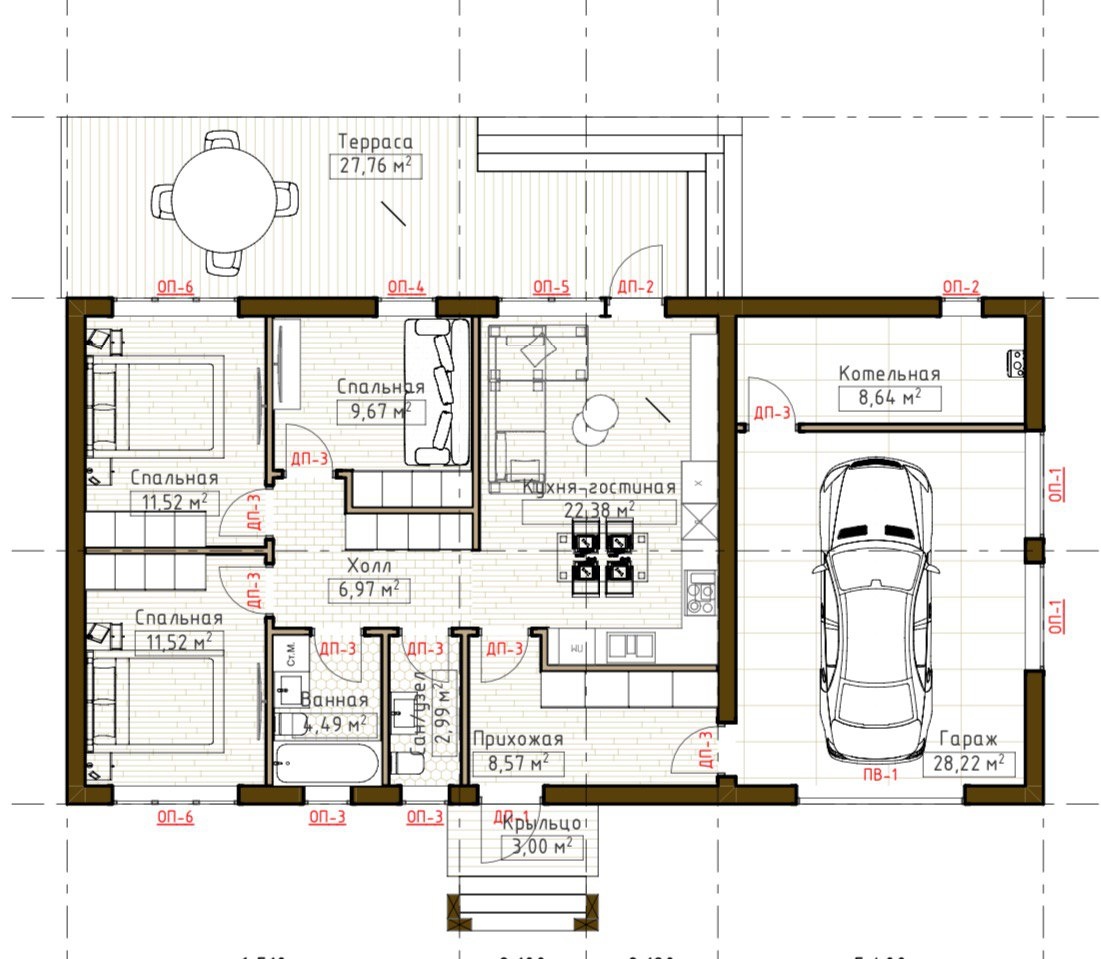 Три спальни: две по 11 кв.м. и одна 10 кв.м., кухня – гостиная 23 кв.м. с выходом на террасу, два сан.узла, тех.комната. Высота потолка 2,8м. Гараж 28 кв.м.
